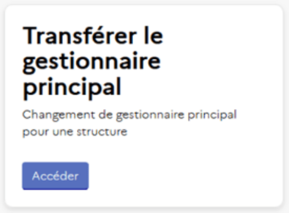 Retrouvez au lien suivant le pas-à-pas dédié au transfert du rôle de gestionnaire principal (lien vers guide utilisateur « Gérer les structures » - https://portail.chorus-pro.gouv.fr/aife_documentation?id=kb_article_view&sys_kb_id=a9a64c13c3946e18bdf5511ed40131fb