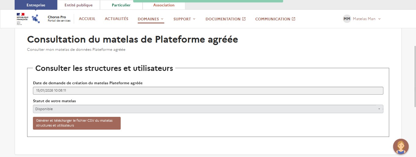 Seules les "plateformes agréées", ou bien les entités ayant candidaté auprès de la DGFiP pour le devenir, doivent générer un matelas de type Plateforme Agréée (suivant les modalités décrites plus bas dans ce guide utilisateur). Inutile de générer un matelas de ce type si vous êtes une entreprise classique.