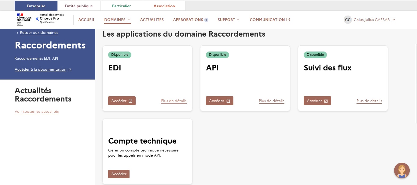 Vous serez alors redirigé vers la page d’accueil de l’environnement de qualification du portail de services Chorus Pro.