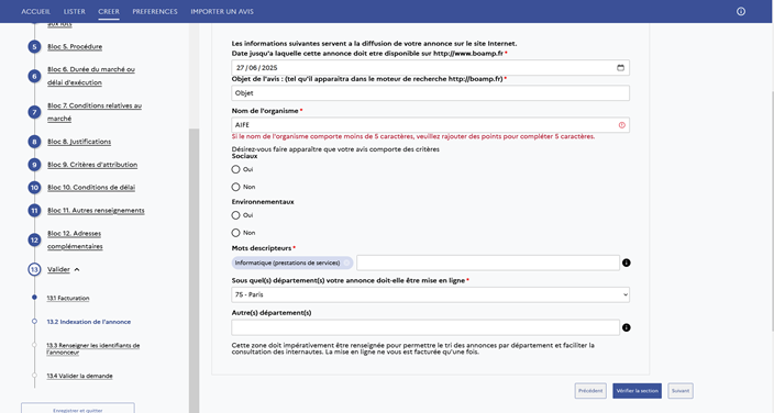 A gauche de l’écran, un stepper vous indique toutes les étapes nécessaires à la création d’un avis de publicité. Vous pouvez suivre l’avancement du processus figuré par le point bleu.
