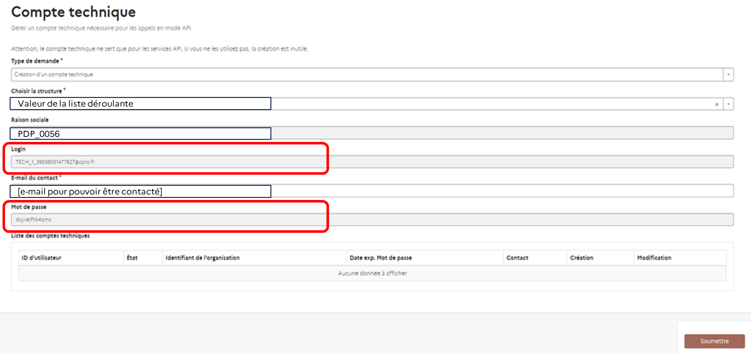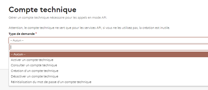 Point d’attention : Veillez à bien noter les identifiants (ils vous seront demandés pour les appels API). En cas d’oubli, le mot de passe pourra être réinitialisé avec le type de demande « Réinitialisation du mot de passe d’un compte technique ».